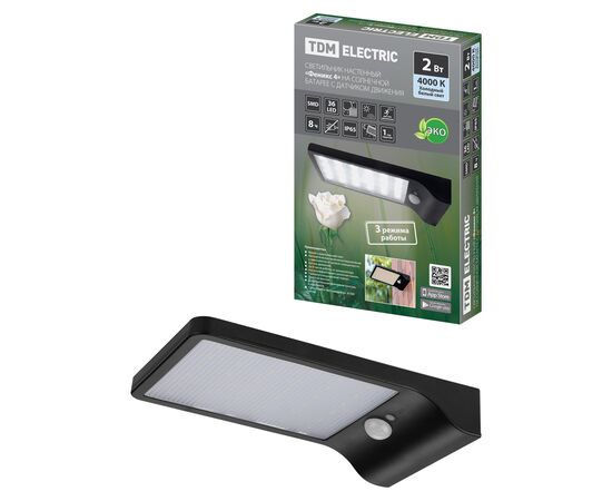 Светильник настенный "Феникс 2" на солн. батарее с датч. движ., 2 Вт, IP65, пластик, черн., TDM(SQ03